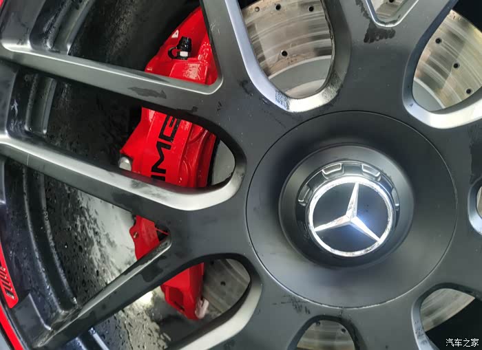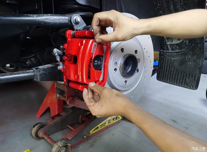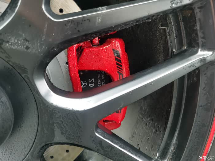 后轮只更换刹车盘,原车小卡钳进行喷漆然后贴上AMG字标。