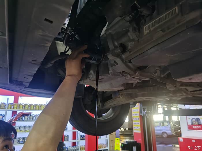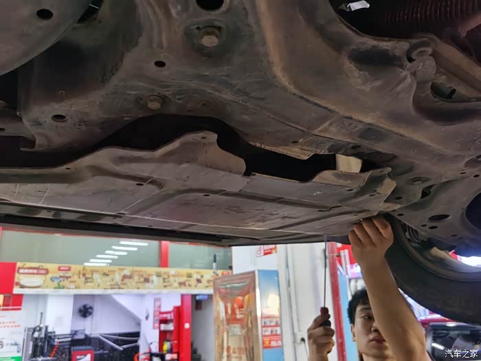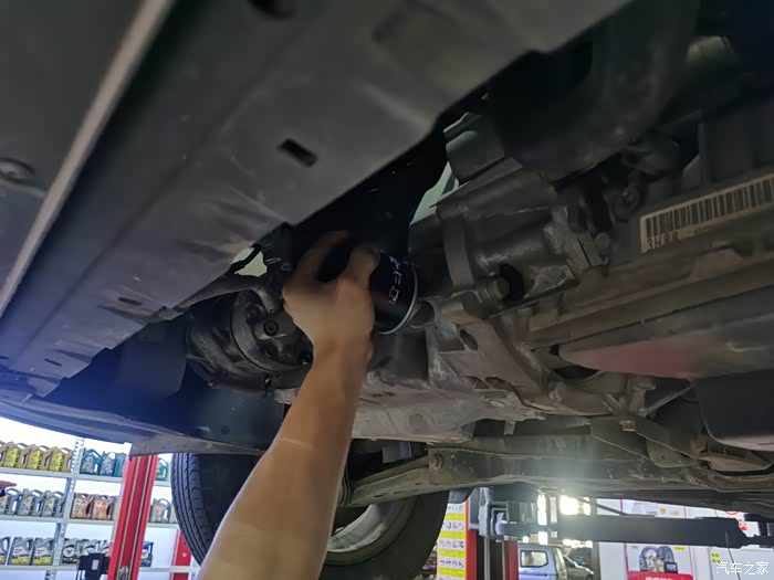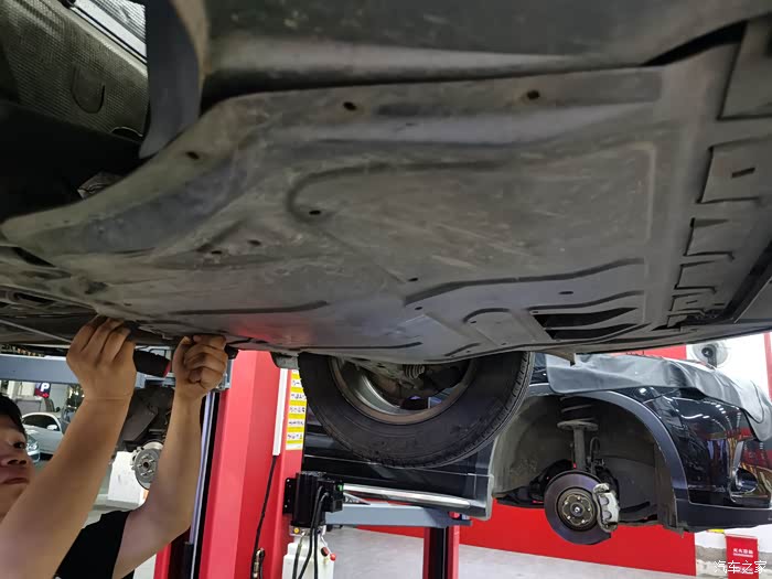 升降台开始缓缓升起,准备开始更换机油,本次机油还是选择某品牌的全合成机油。