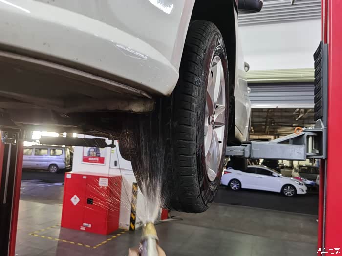 之前和检修师傅提前过左前轮有漏气现象,师傅用常规操作检测漏水的地方。