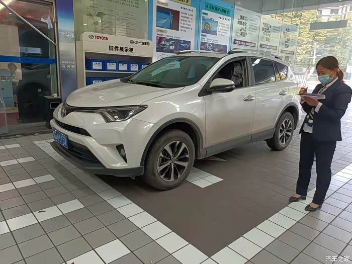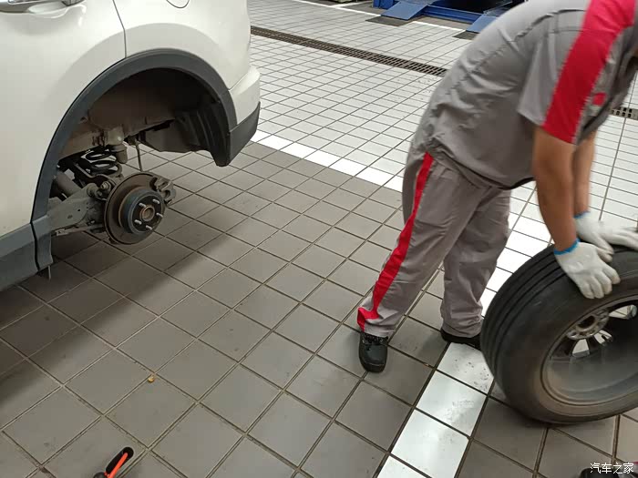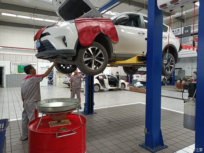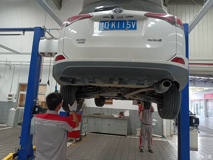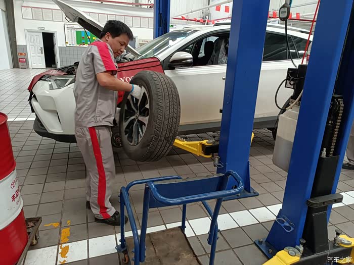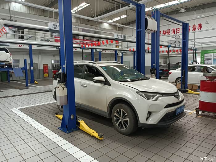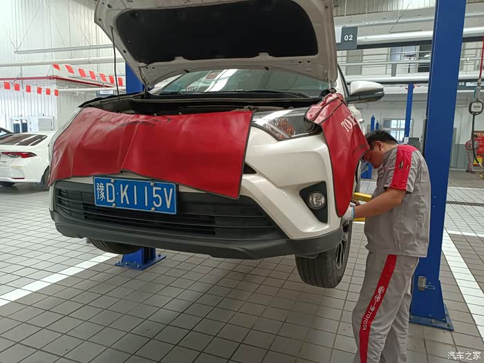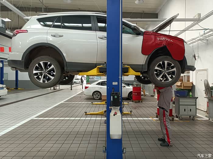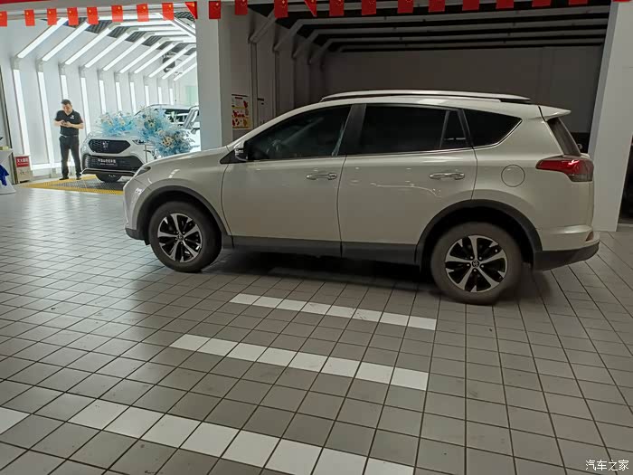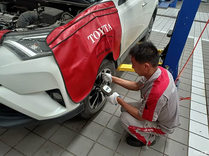 保养车的师傅正检查轮胎气压,我请教了一下荣放这个车涉水高度是多少,这个师傅说没有明确规定是多少,不过水淹到车轮中间的丰田标最好就不要趟水了