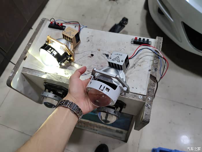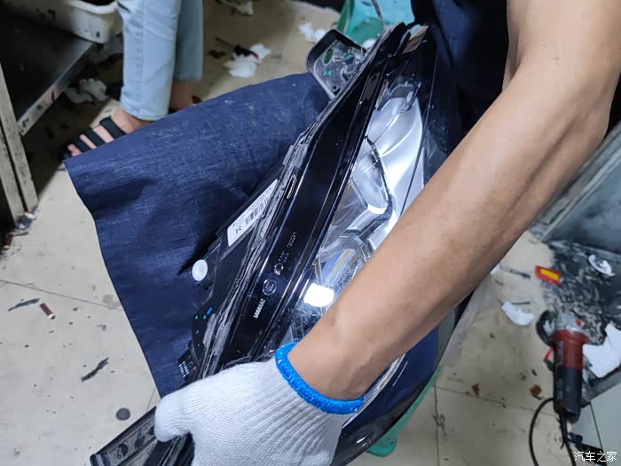 调整角度,确定大灯支架的螺柱打孔位置,此时还没除灰,所以看着透镜内有斑点
