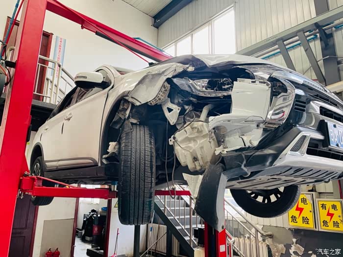 保养车间,一辆被撞得面目全非的欧蓝德。