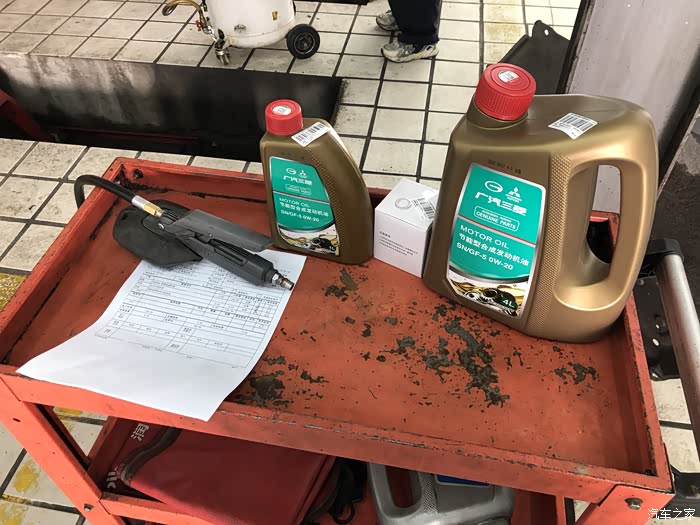 这是准备倒进的新的机油,1大1小,合计5L,不过不是一次性倒完,是用掉4L多一点