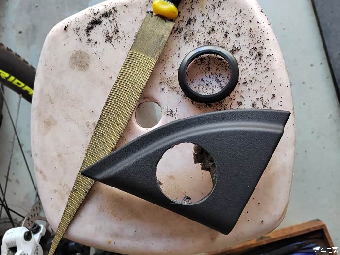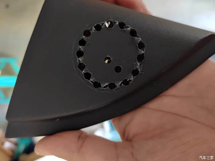 三角板这个位置,空间小,分频电容被迫改装到门板里了,黑色那个胶皮柱有点碍事,挖孔的时候最后避开,有可能高音***去跟它冲突。