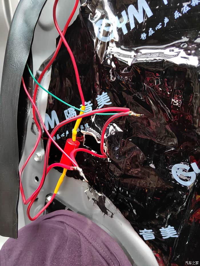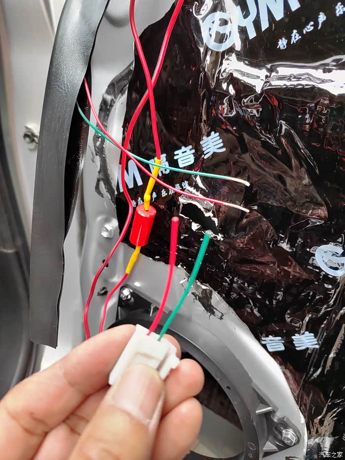 至此音响改装第一波完工,耗时五六个小时,花费二百八九十块钱。耗时间是因为期间要把高音喇叭卖家给焊好的电容挪位置,高音和低音之间又没有插头对接,都是烙铁的活,加上挖孔,费时费力,第一次拆车,对结构不清楚。先做了左门,后来做右门就轻车熟路了。