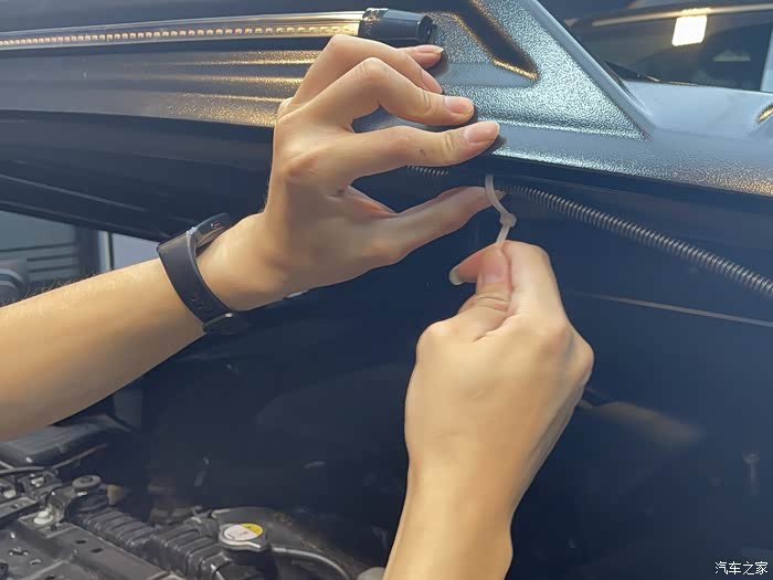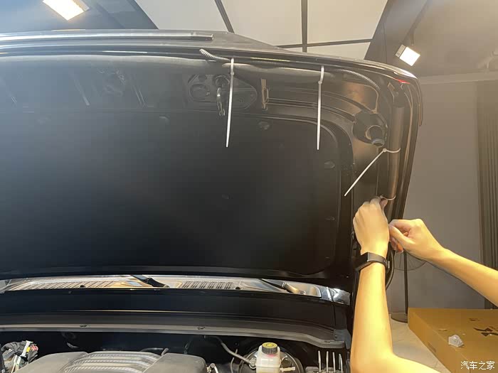 全部都沿着机盖把线固定住,这样比较美观也不会形成阻碍,距离也要掌握好不然多了也没啥用还浪费资源。