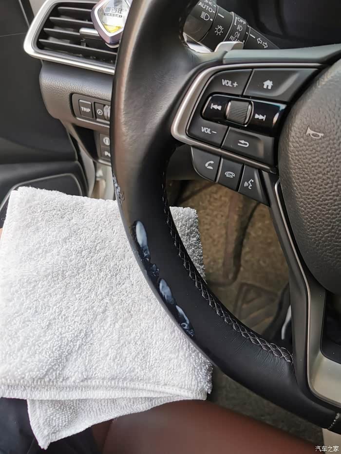 施工前的方向盘有点脏啊,先用微湿的毛巾擦拭一遍