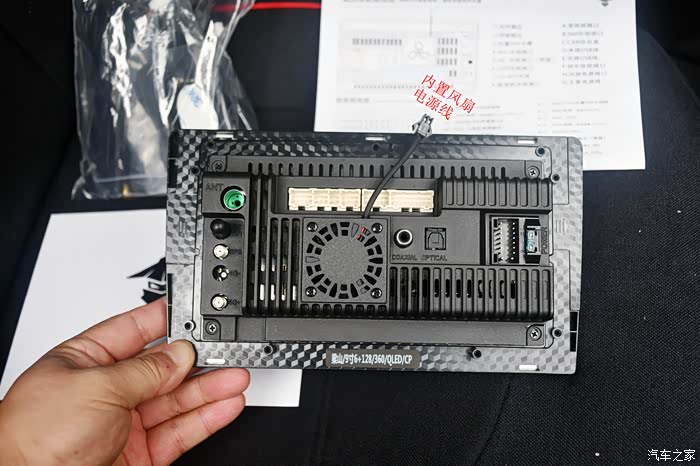 来看看背面,也是通用的外壳和接口,所以可以和同类的大屏线束公用。值得一提的是,梁山车机预置了机内风扇,可以强制风冷。这样就解决了暴晒情况下其他大屏容易出现的高温过热死机的问题。而且机子里温度低了,性能自然就稳定了,所以也是这款车机的一个优势。