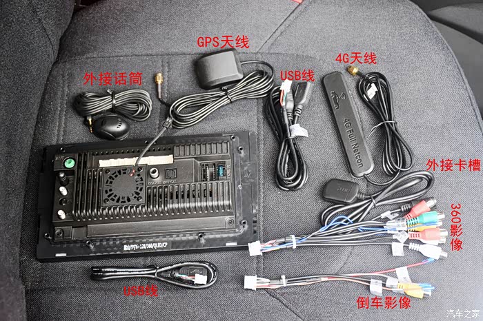 看看都有哪些配件。除了主机外,还有外接话筒、GPS天线、双口USB线、单口USB线、4G天线、外接卡槽、360多媒体线、倒车影像线。因为我买的是单主机套餐,所以东西比较少。如果你的车没改过导航,还需要买一根专车专用线缆,才能和原来车上的线束对插。