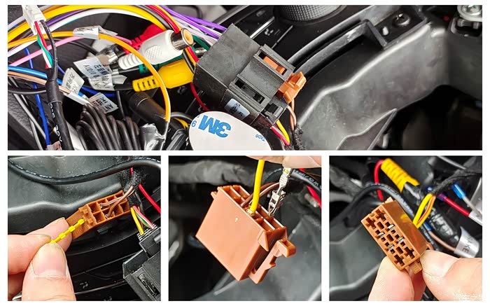 找到前面的原车喇叭插头,就是棕色的这个插头,将里面那个黄色的卡子拔出来,然后对照线束颜色将右侧喇叭线缆插入左侧喇叭线缆的旁边。最终效果看右下角的图,不要忘记将黄色卡子插回去。别问我为啥这样说。我是不会告诉你们我装完了发现这个卡子没装,又拆了一次。
