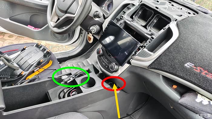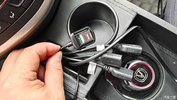三根USB线和外置卡槽线都从奔奔点烟器旁边那个方孔中穿出来,将来放扶手箱下方。这样既能隐藏起来,以后插接设备换卡都方便。