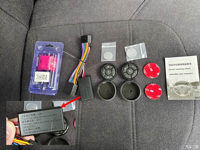 方向盘按键定好位置,用附带的打孔器开孔,然后将胶垫和按键放入孔中。结合的很近,开始装不进去,后来抹了些洗洁精才进去,所以不用担心会掉下来,挺紧的。