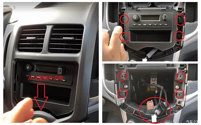 先把收音机边框拆掉,从双闪按钮那里比较容易撬开,拿下来时注意双闪的线,不要太用力,拔掉双闪插头就能取下面板了。然后拆掉右上图红圈中的4个螺丝,收音机就能取下来了。右下大红圈内是收音机后的线缆。棕色是喇叭线,黑色是供电线。圆的是天线,白色的是双闪插头。