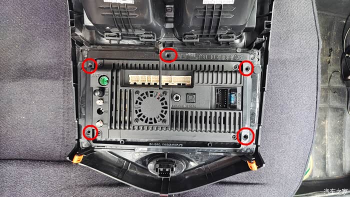 将红圈位置的螺丝拧掉,就能摘下低配车机,让车机和外框分离。然后将梁山车机装进去,用梁山车机自带的螺丝拧紧。五个螺丝都要上好。防止松动。