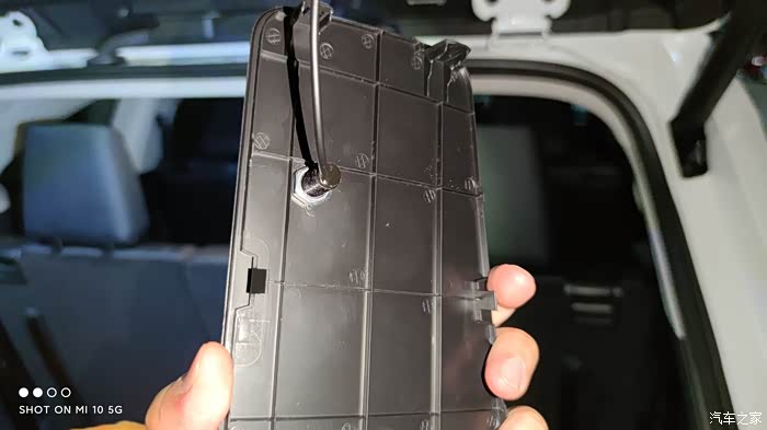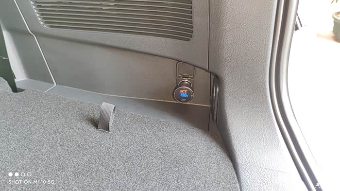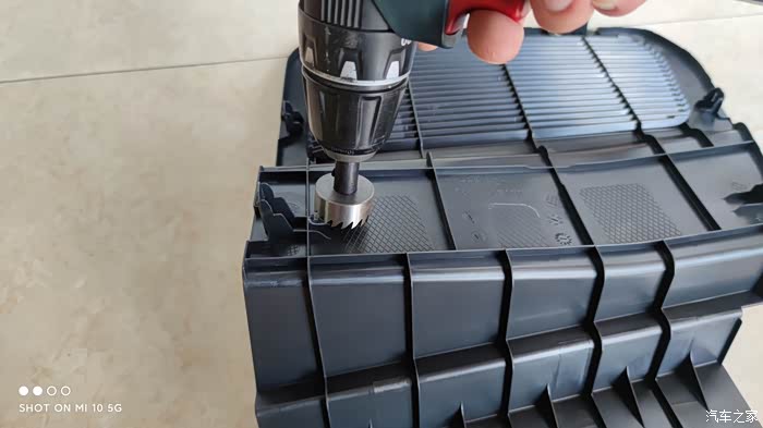 打洞的位置,位置选在这里,是因为背面空余的位置还有很多,而且这个位置是凹陷下去的,插入点烟器电源头也不容易被尾箱的物件碰撞