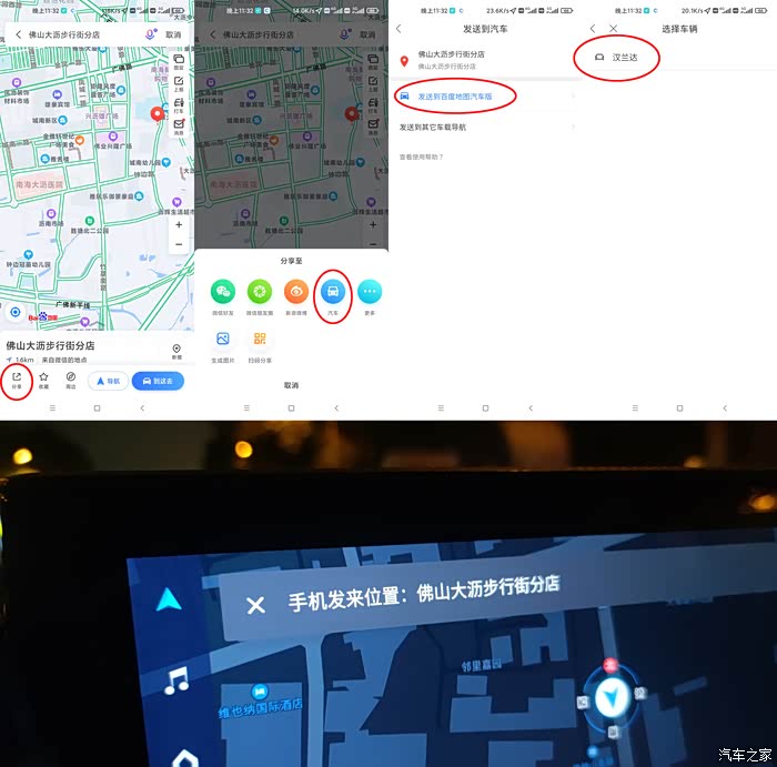 点击分享--->分享至汽车--->发动到百度地图汽车版--->发送车辆汉兰达
