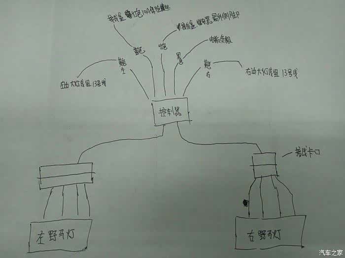 确定接线位置1)控制器接汽车有五条线红线黑线蓝线两条黄线。1.红线接电源盒继电器最外侧脚。2.蓝色线接近光灯保险就是电源盒内10A?红色保险。3.黑线搭电瓶负极。4.黄色线接灯组线插头?13号线。5.同样黄色线,?4.左右分开。