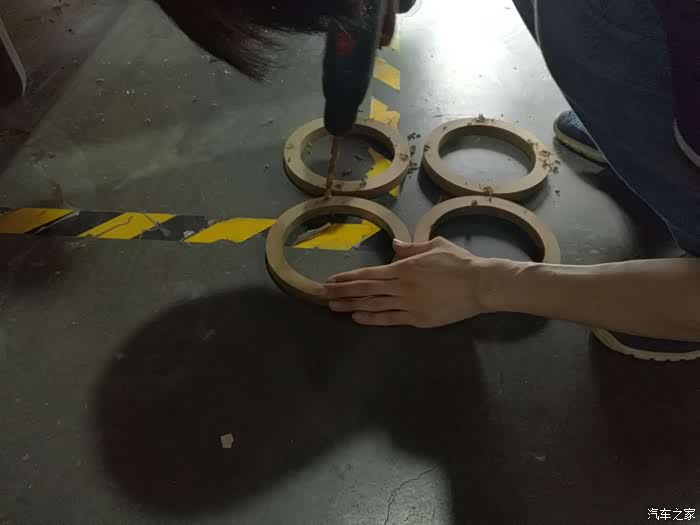 还在欣赏自己选择的设备时,看到了师傅拿出四个木圈打孔,问了下是干啥的,师傅说固定喇叭用的。