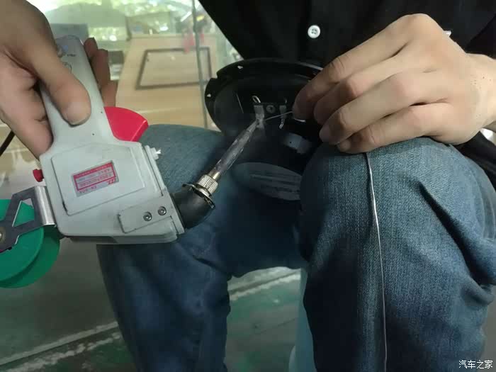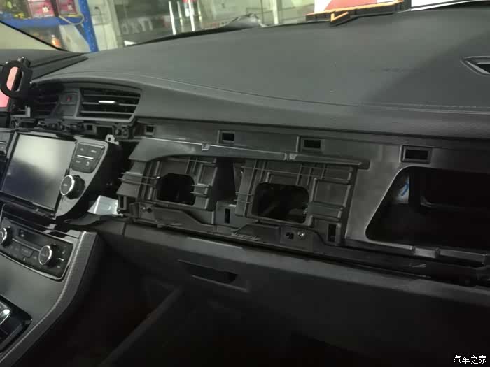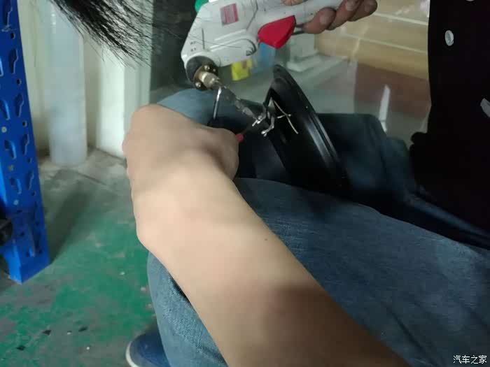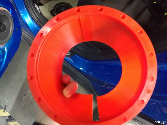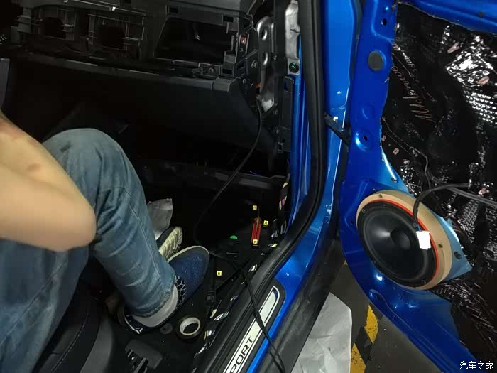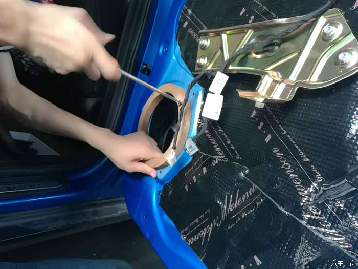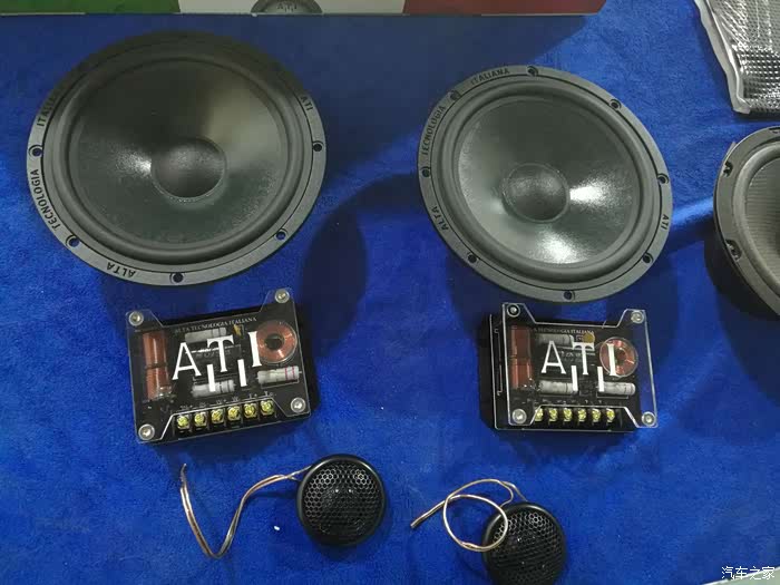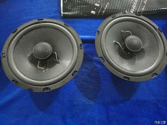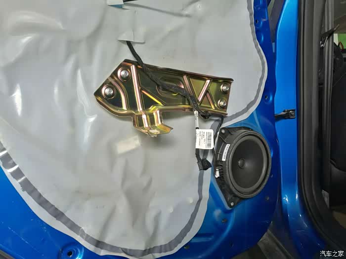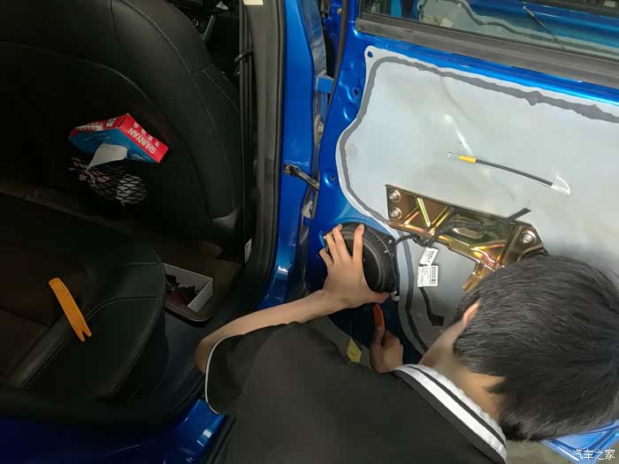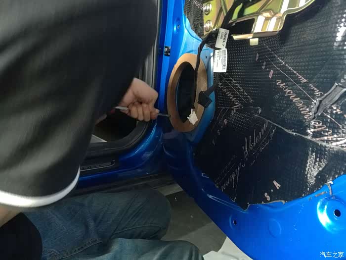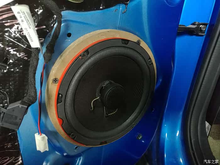 趁师傅还在贴四门隔音,来一下喇叭的特写,这张是前门的喇叭,中间是分频装置,下边是两个小高音