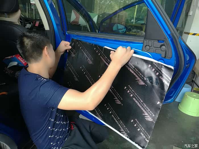 马上开工,首先是拆开门板做隔音,这时看到原车里面的隔音,中规中矩,老师傅还教了我怎么判断门板隔音做得好不好,就是用手在门板外边轻轻的敲敲,听敲打的声音结实程度来判断隔音的好坏,当然越结实的声音表示越好,反之越空荡的声音越差。