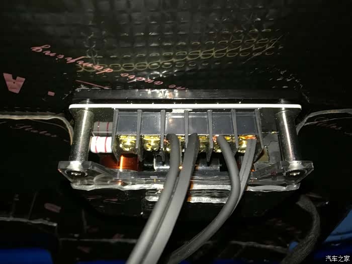 这个分频装置有6个接位,2个接电源,2个接中低音,2个接高音,还有两个接位没接是因为高音还在门板上,在装门板接高音之前特写一张