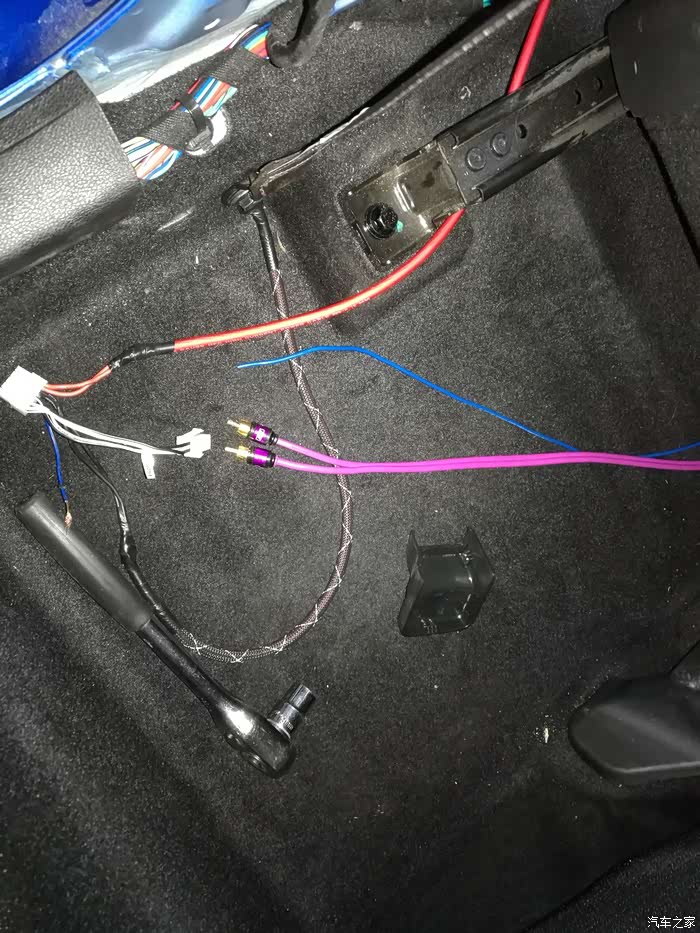主驾驶位底下需要的线,黑色是地线,紫色是音源线,红色是电源线,蓝色是启动线