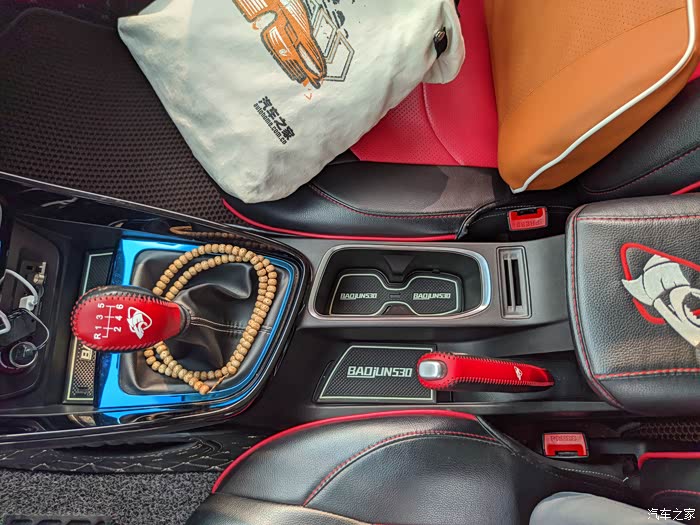 纤维轮毂贴、蓝红色中网装饰、车窗晴雨眉、门把手门碗、挡泥板、轮胎装饰盖帽、全车贴膜。还有一些汽车之家的金属车标、后备箱尾门装饰等。内饰的话:改装的特别多,全车的仪表台垫、全包围脚垫、后备箱全包围、半包围脚垫、全车的红黑色全包围坐垫、记录仪。全车的垫子。等等.............