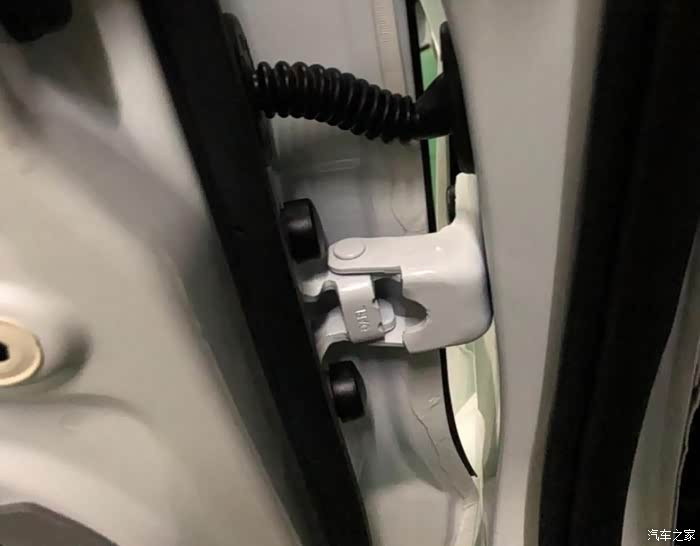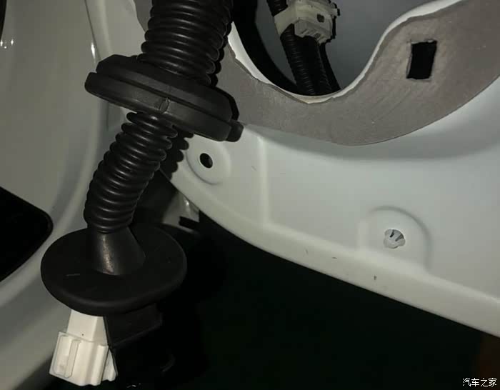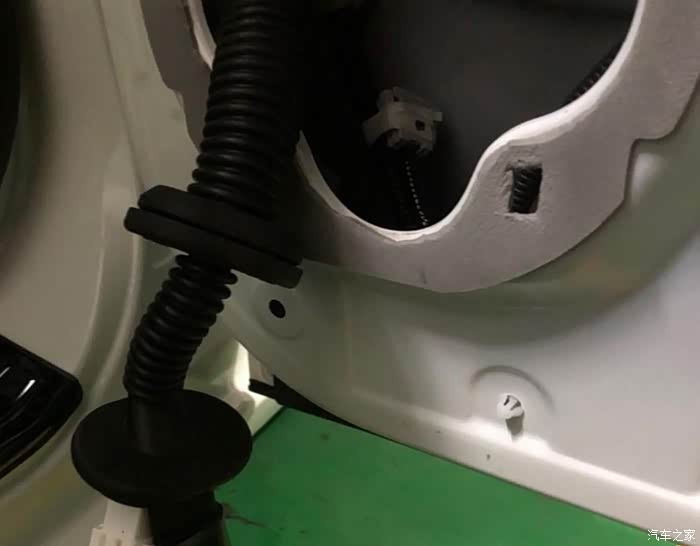 再把这个橡胶管从门柱那里,往后门里面挤进去,拉出来,白色插头这块,是有电工胶带固定的,先拿下来,再开始引线