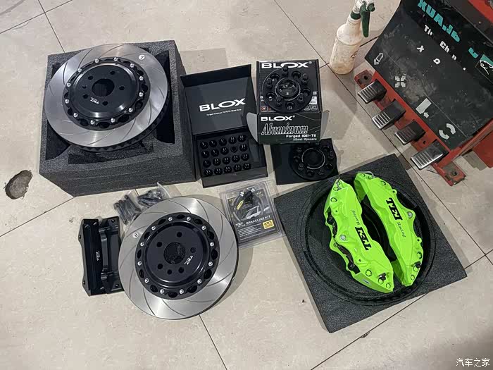 配件清单:TEI P60 NS绿色大六活塞卡钳,TEI刹车皮,TEI 355×32mm划线盘,TEI刹车钢喉,TEI 7075-T6桥码合头,Blox 6061-T6 15mm法兰盘,Blox 7075-T6螺丝,博世DOT4刹车油,之所以还用DOT4刹车油是因为纯走街,不下赛道,也不频繁暴力的一脚油门一脚刹车,不用考虑热衰减,只考虑突发状况。TEI所有的螺杆也采用了12.9震级。