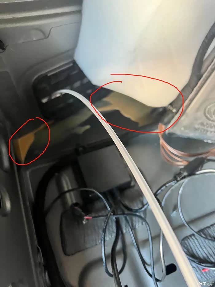 走线时候发现的,我以为是咖啡洒了,但是又不可能洒在这,这是防锈蚀的什么液体,这工艺实在不敢恭维,组装这部分的师傅可能跟老婆吵架呢。大家可以回去掀开后备箱底板看看是啥样的。