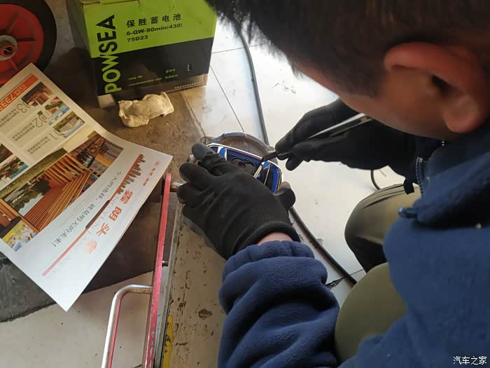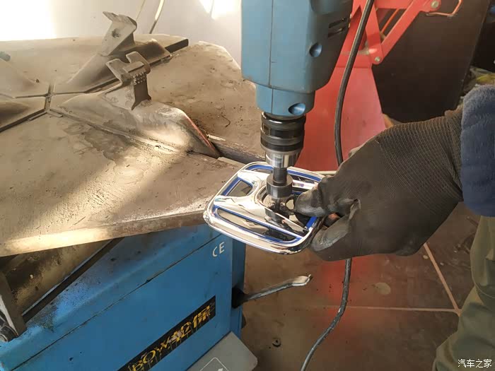 ,标后固定住已被砸断一部分4s建议用钳子夹起保险杠内固定车标的铁环,安装师傅则换了个方式,用套筒伸入砸掉前标的固定柱