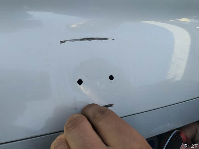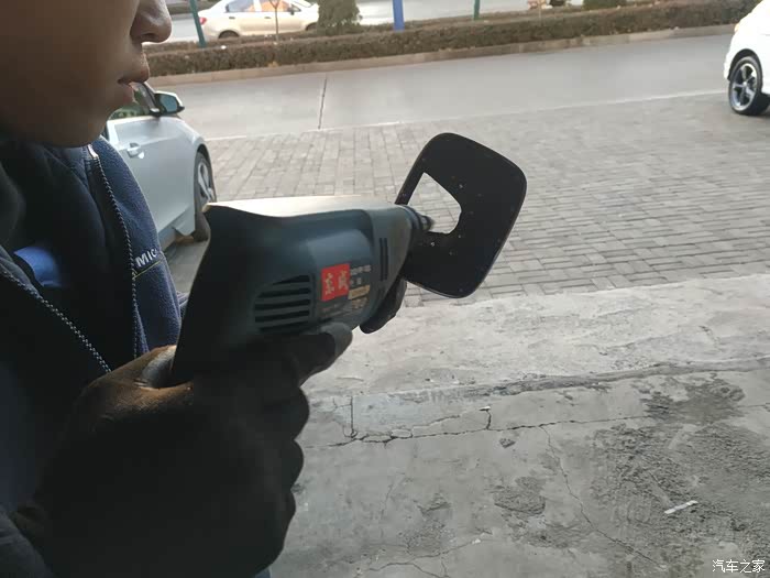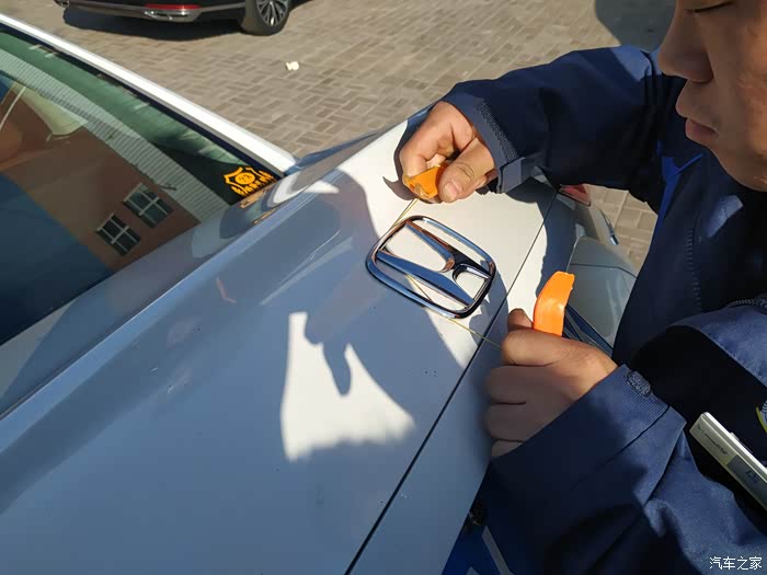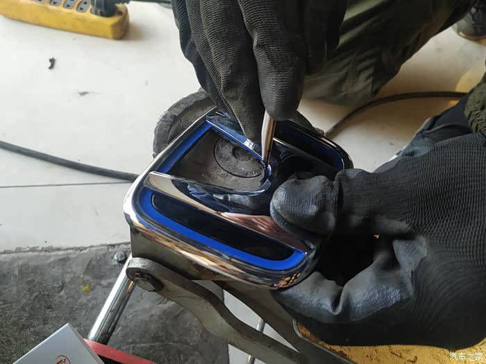 打孔处理好,要用刀片对车标内圈部分进行反复切割,这里需要用吹风机加热刀片才能割开,师傅为此废了两段刀片头