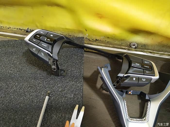 拆掉方向盘上的按键和装饰,共有四个大螺丝需要卸下,其他两个小螺丝不需要动