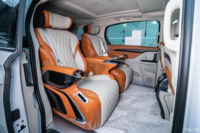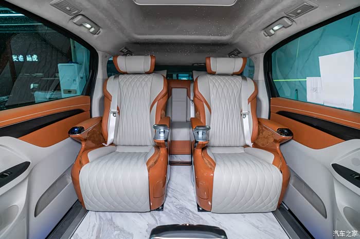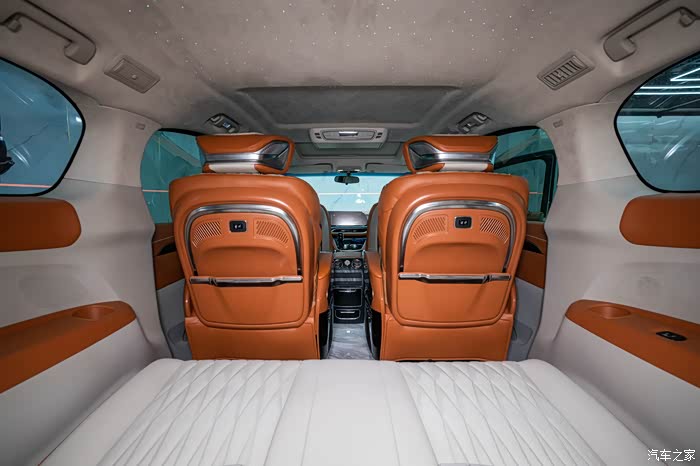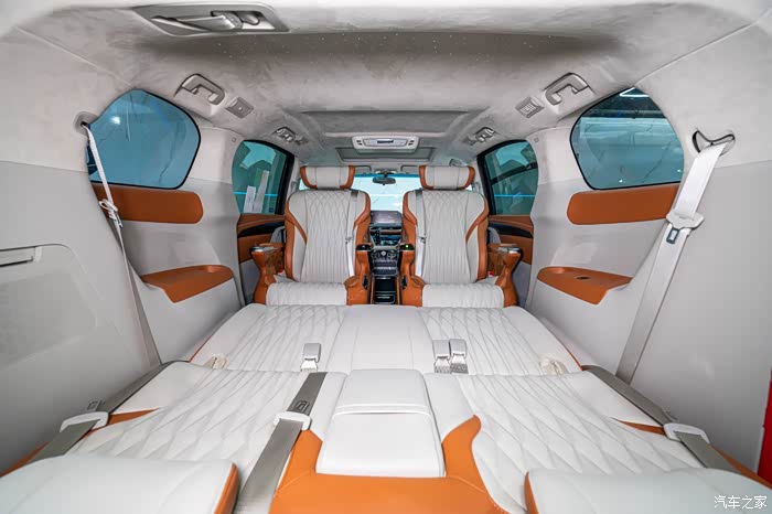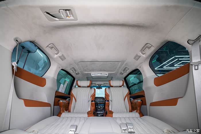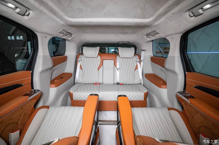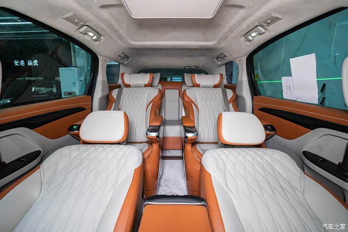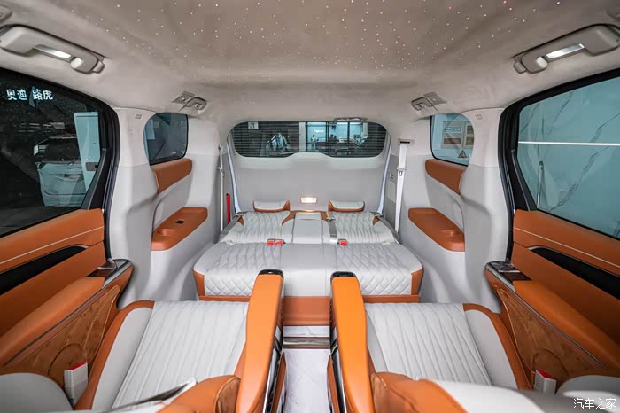 改装清单:1.耀影包围总成;2.大叶棕内饰;3.中排航空座椅;4.前排电动座椅;5.前排座椅通风加热;6.一键解锁旋转盘;7.隐藏式轨道;8.豪华双控三排沙发床;9.无线充小桌板+休息踏板;10.真皮方向盘;11.仪表台+中控台软包;12.进口鹿皮绒顶棚改色;13.ABCD柱进口鹿皮绒;