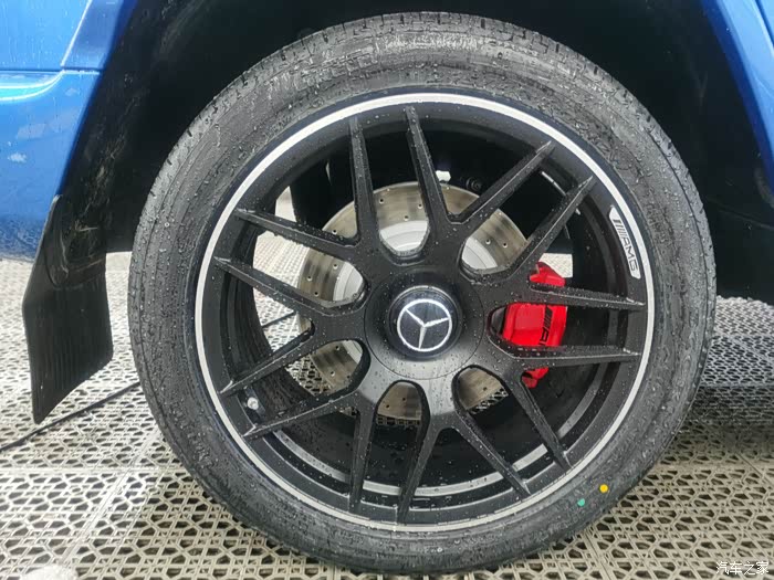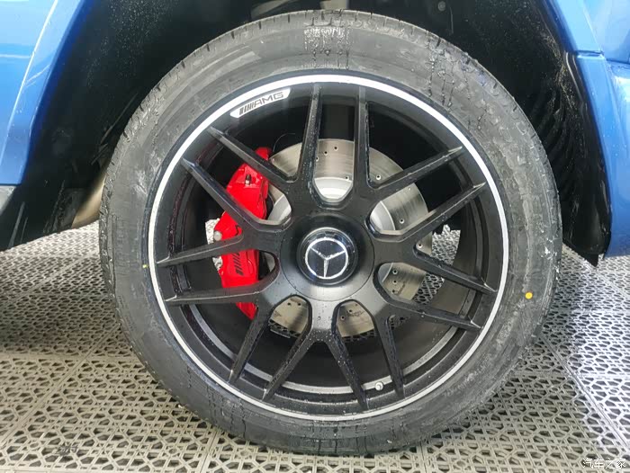前轮更换老款G63六活塞卡钳,后轮卡钳喷漆贴AMG字标。