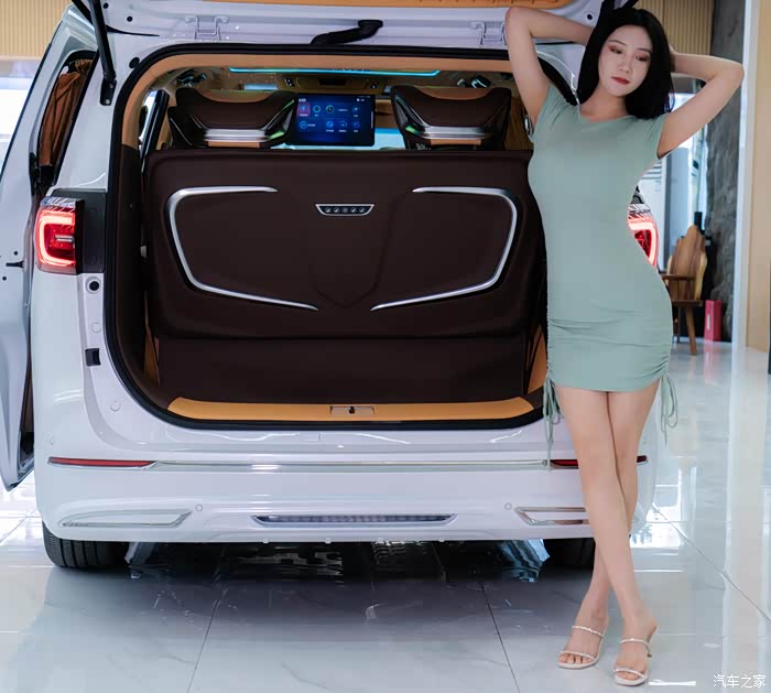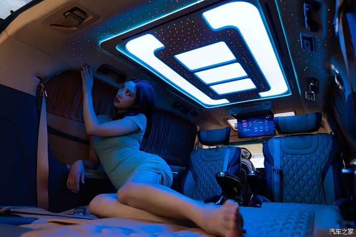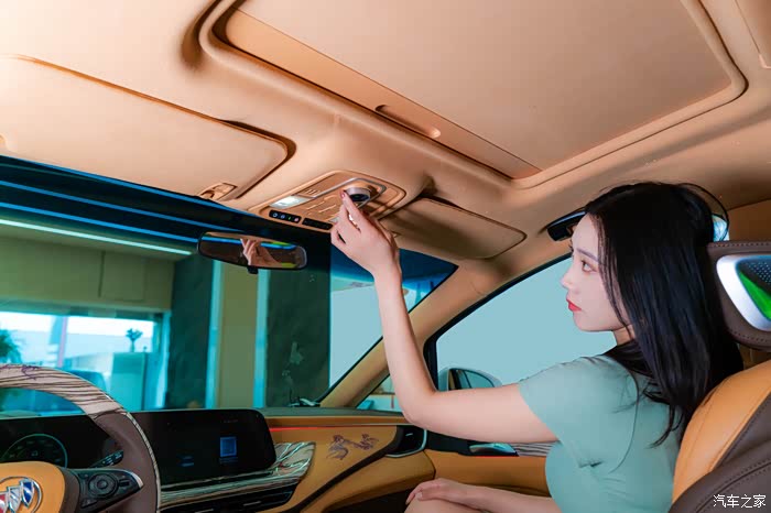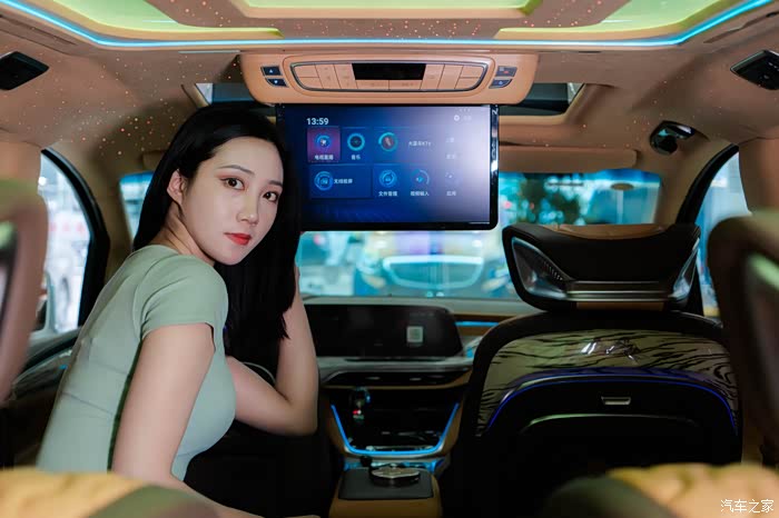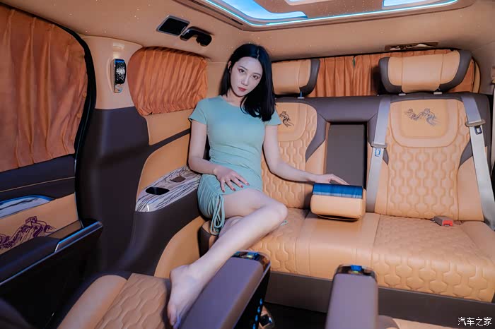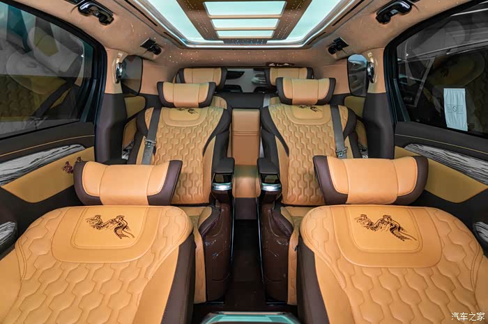 我选了咖色和宾利黄的内饰颜色搭配,然后就是中排的二代水晶座椅,要智能有智能,要豪华有豪华。最后值得强调的就是车内大面积的长城图案和刺绣,比如带LED长城图案的印花地板,座椅、中控台和侧板的长城刺绣,坐进车里很有仪式感,除此之外细节上的改装,比如定制吸顶电视,小桌板,劳斯莱斯同款的星空顶,网红款双月湾顶灯,迎宾光毯,第三排沙发床,一个比一个有排场。