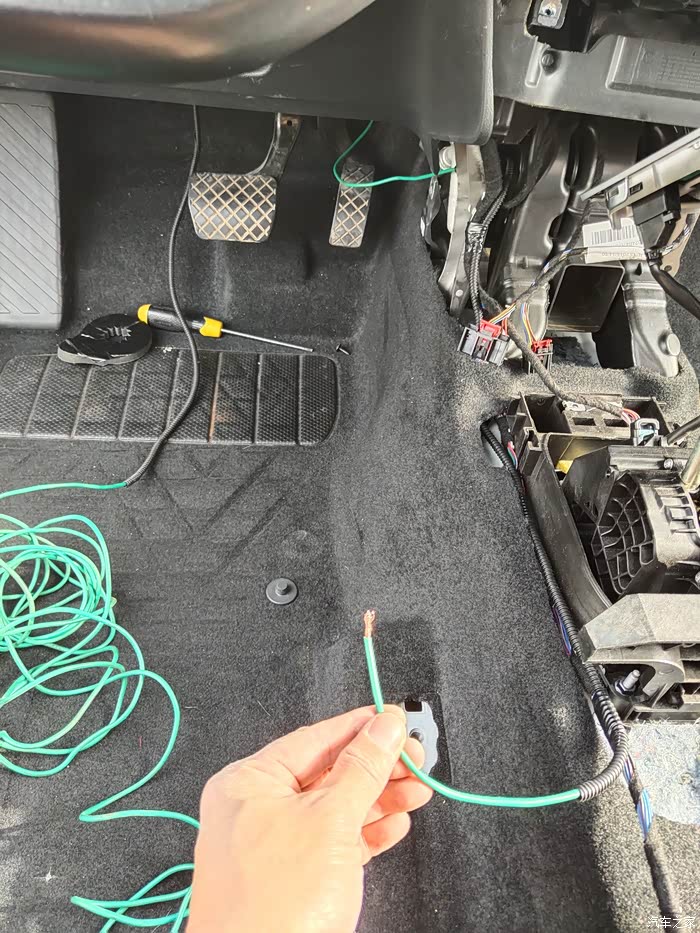 开始走线,那根绿线是电瓶正极桩引过来的,是主.常电.电源这也是最好的取电方法了,以前安过几台车了,都是这么走线的。