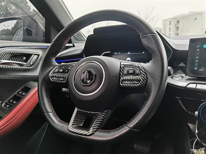 部分名爵5比较注重运动元素的展现,内部虽然还是以黑色为主题,但是加入鲜艳的红色来形成对比,进而体现其运动的氛围。而且我还加装了氛围灯,晚上特别有感觉。