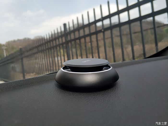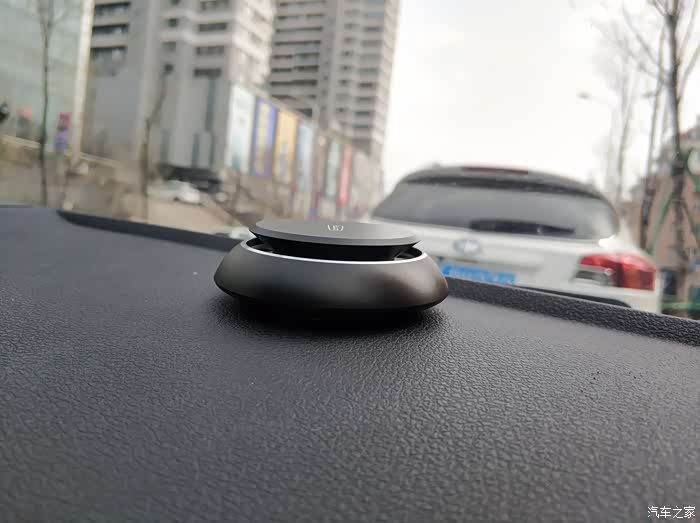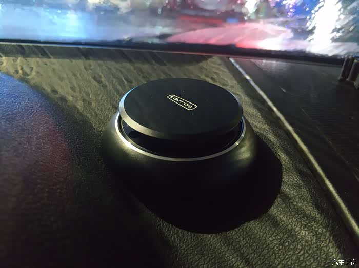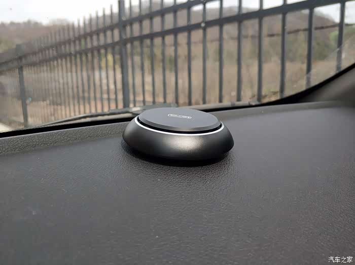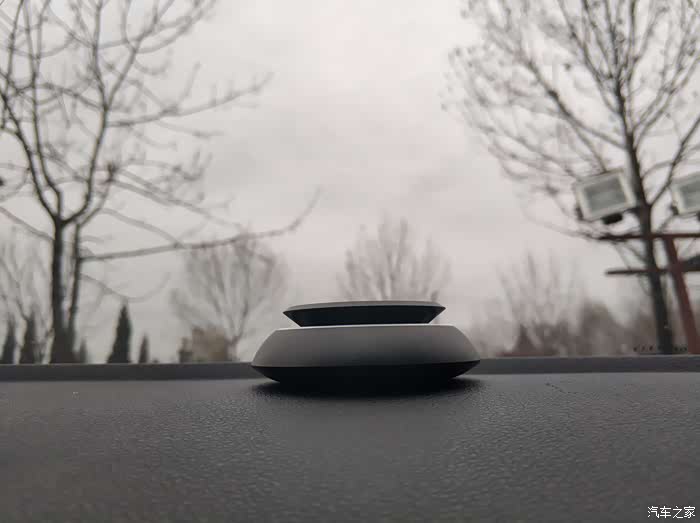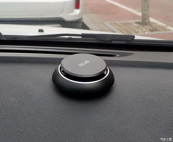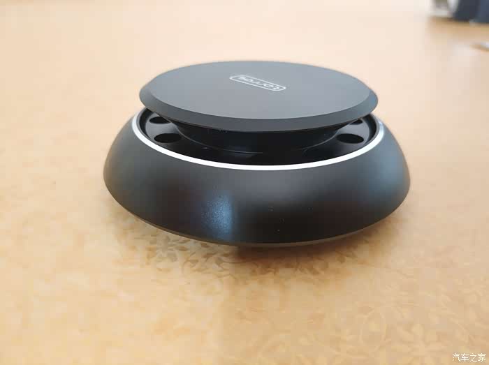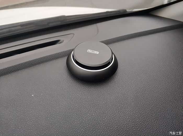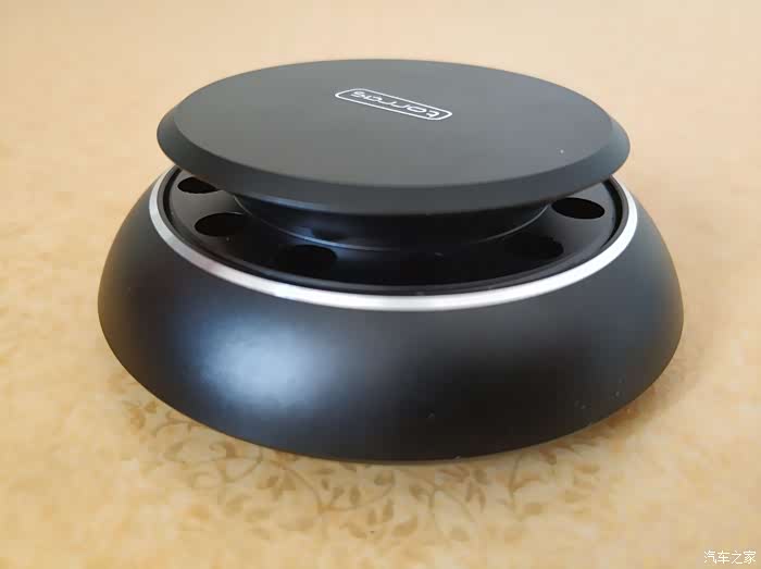 拿在手里有一定的分量,我在想把这个放在车仪表盘上,夏天会有会晒的很热啊,他这个底部有双面胶,还是不错的,可以牢靠的固定在车中控台上,基本上可以防止有急刹车的时候飞起来伤到人。这个上部有一个明显的品牌LOGO。