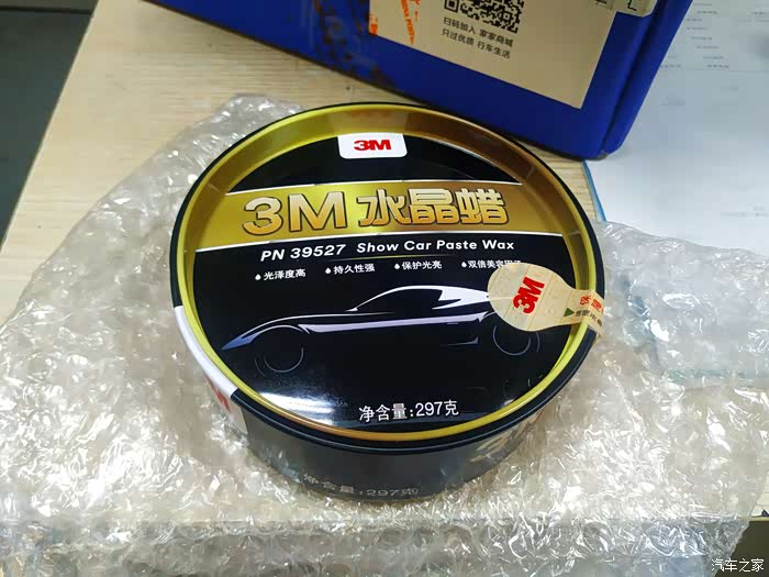 立马拿进来打开看下,包装包的也是很好,一个大箱子包着一个小盒子在里面能晃动,打开看一层泡沫纸包着人小盒,拆开包装因为运输摆动蜡散了不影响使用没事。东西到了半个月了一直没空直到今天,车子半个月没洗好脏,又没光泽,洗干净上蜡咯,3M蜡效果直的很好,不说了上图哦,没文化你们凑合看一下吧。