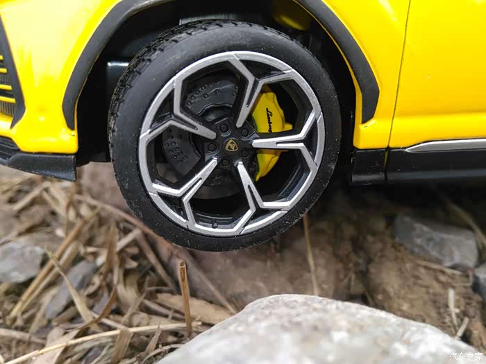 前轮细节,卡钳还可以,车胎有纹路,轮毂带兰博基尼车标。