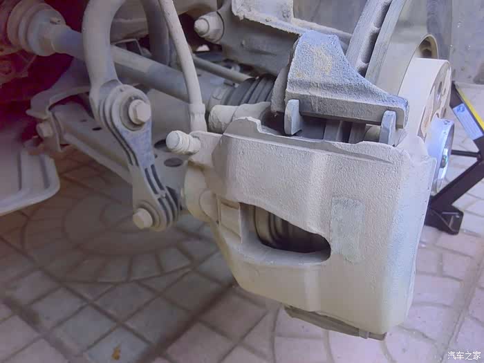 支起千斤顶后在把所有螺丝都卸掉。拿下轮胎就看见卡钳了。千斤顶有专用顶位,千万不要顶错了。