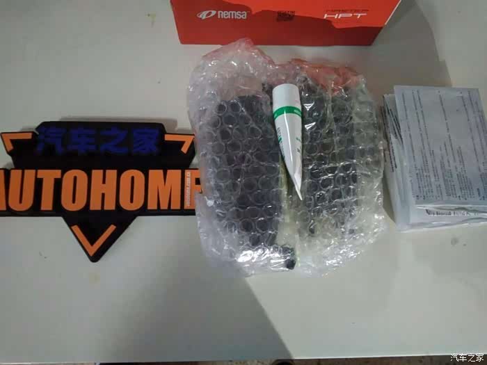 产品全家福,包含两对刹车片,两本厚厚的说明书,一支保护剂。刹车片用气泡纸包裹,防止运输时损坏,赞一个。