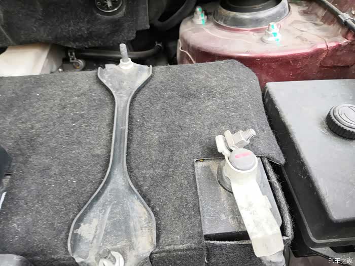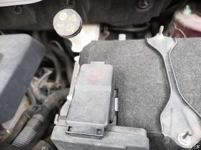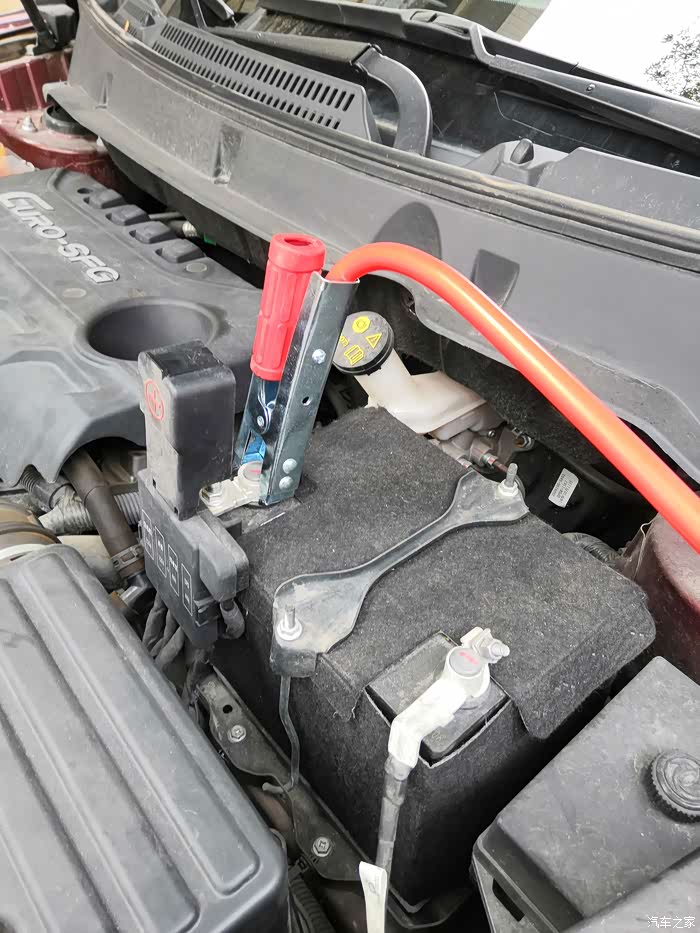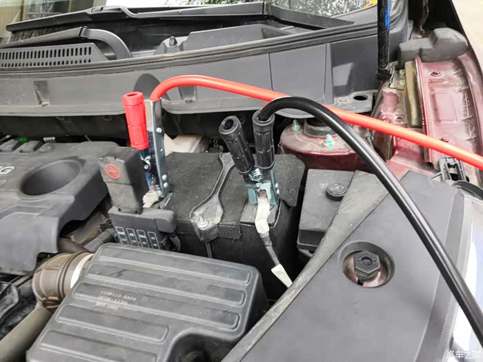 1,首先打开发动机仓中的电池盖,遵守跨接顺序,先把线色夹头夹在无电车辆的正极 上,