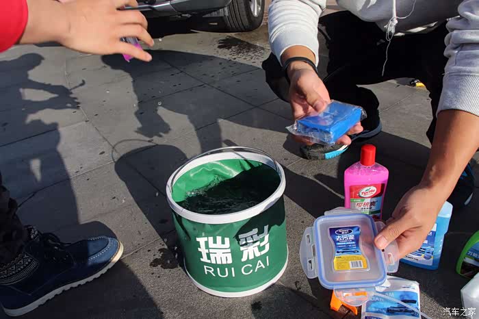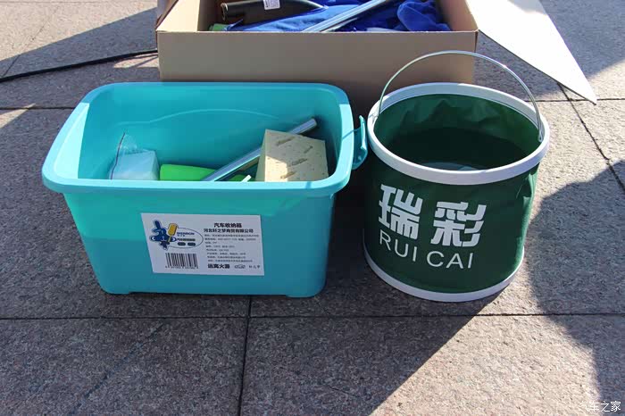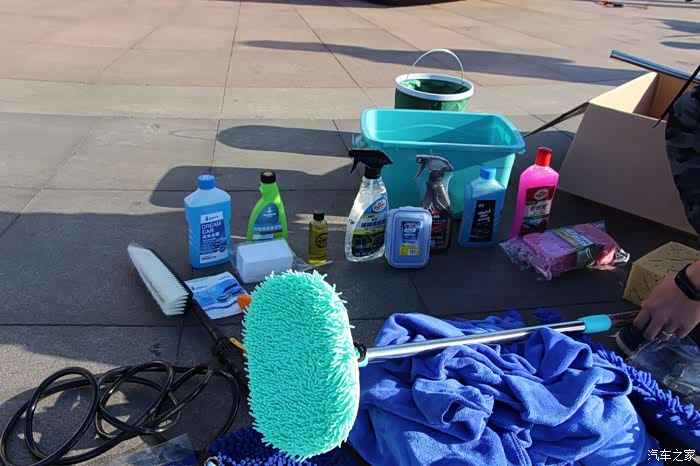看折满满的一纸箱还真不少,水蜡,洗车泥,擦车布,便携式水桶,车刷,洗车海绵,应有尽有