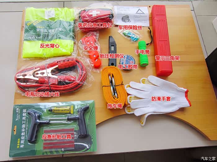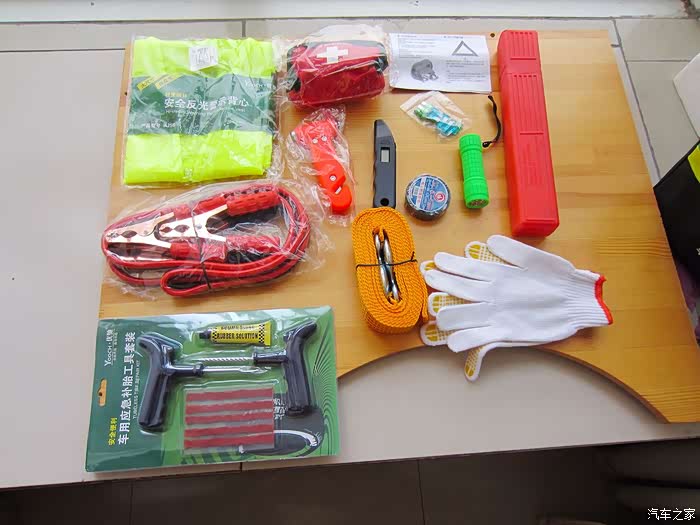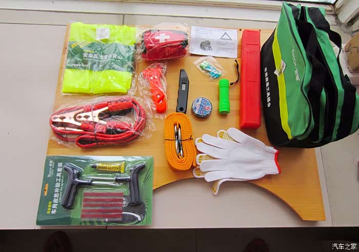 我来标注一下所有商品的名称。十几年的驾龄,我个人认为最有用的就是电瓶搭火线,胎压检测仪,拖车绳,医疗包,至于其它东西,都是可有可无的。保险丝我们的车上保险盒里都会有几个备用件,三角架不用说了,也是必备件。至于补胎工具,我宁可自已动手换个备胎。