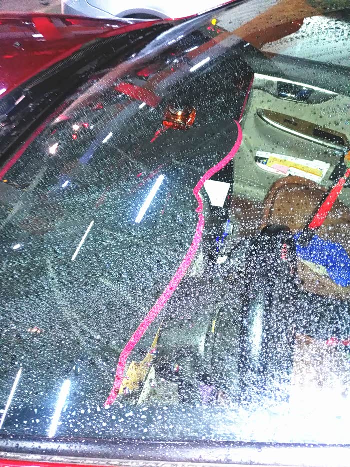 先喷上清水,这时候水是不规则的基本上也覆盖了整个风挡上。即使是擦的干干净净的,还是能看到水流不规则。