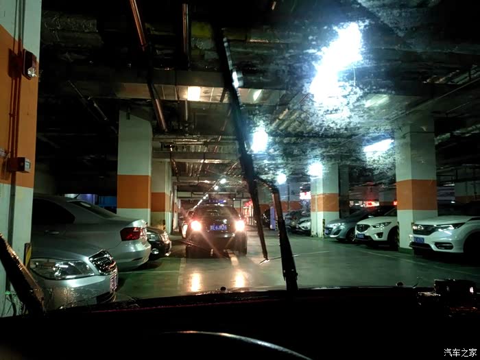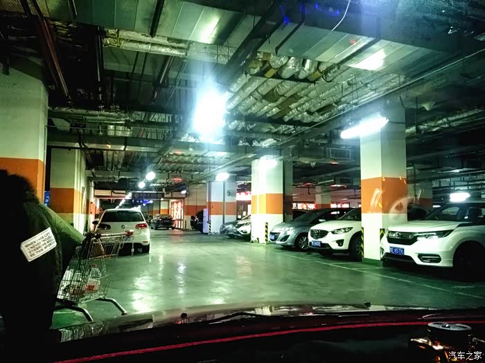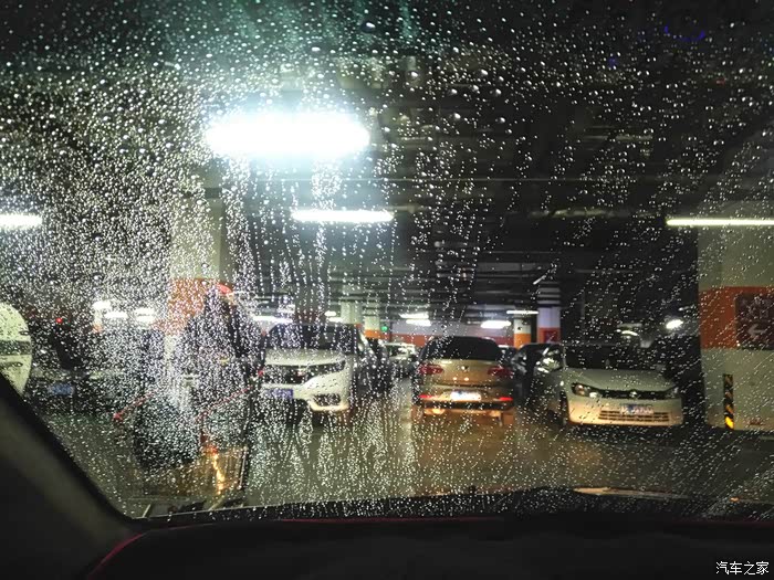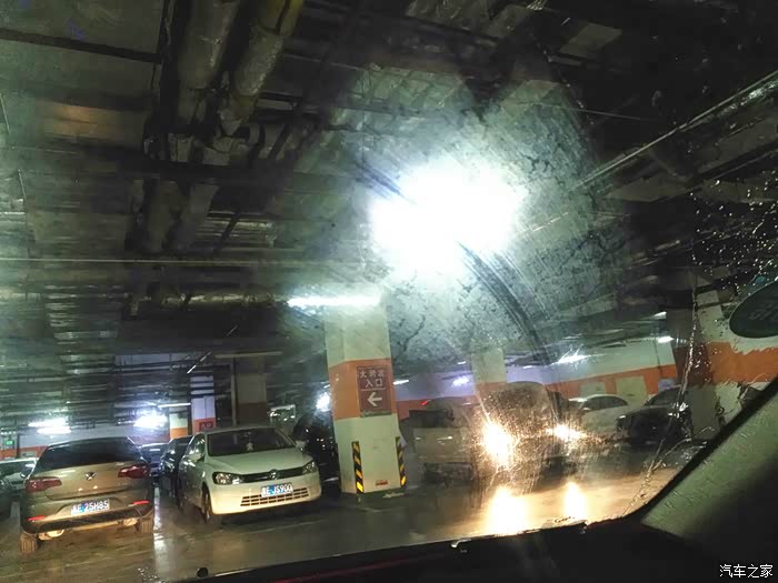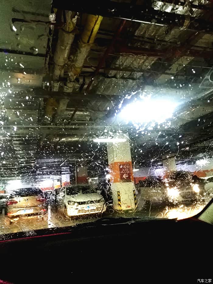 开始正式测试!测试地点超市楼下的地下停车场。来的时候正是人多车也多的时候。刚进来连车位都没有了。只好找个角落把车停好。先用玻璃水把风挡刷一下。