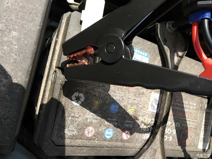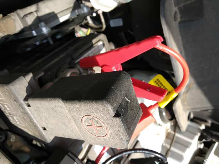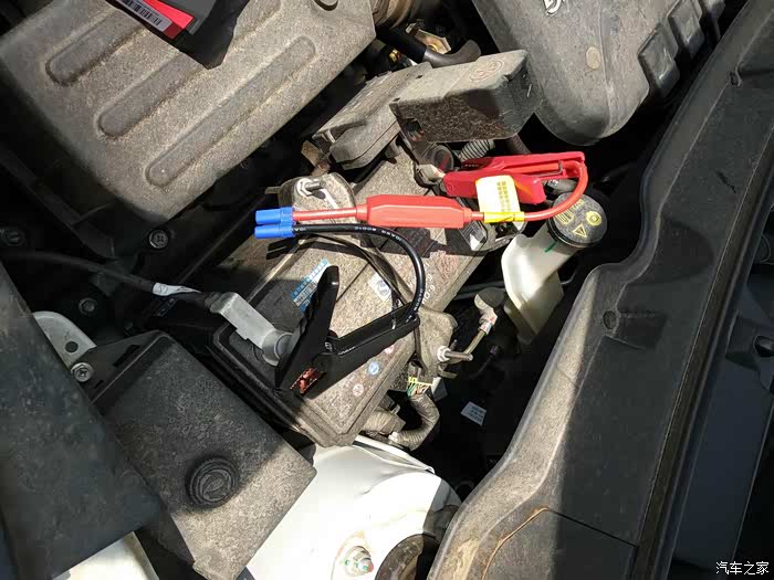当车上电瓶没电时、第一步首先拿出连接电瓶线、找准正负极夹紧