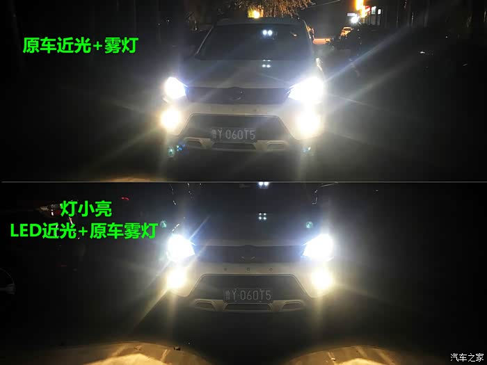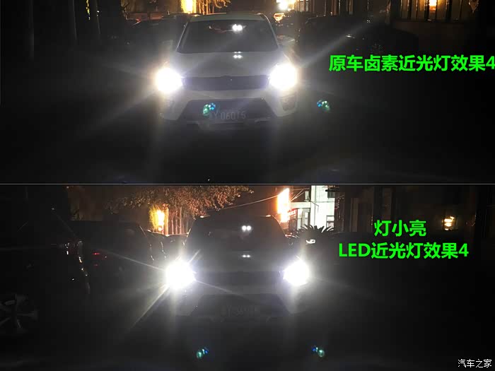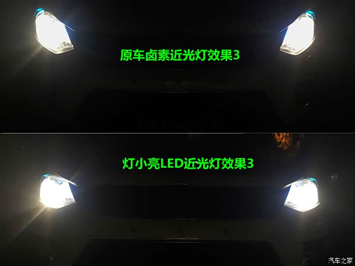从对比图可以看出,灯小亮的LED近光灯还是比原车的卤素灯光要白一些,亮度要高一些,范围要广一点点,相比较卤素感觉光要散一些,不如原车卤素聚光好。